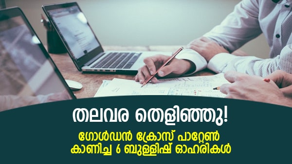 ഹ്രസ്വകാല മൂവിങ് ആവറേജുകള് ദീര്ഘകാല മൂവിങ് ആവറേജ് നിലവാരം മറികടക്കുമ്പോള് രൂപപ്പെടുന്നതാണ് 'ഗോള്ഡന് ക്രോസ്' പാറ്റേണ്. ടെക്നിക്കല് ചാര്ട്ടുകളില് പ്രത്യക്ഷപ്പെടുന്ന ഇത്തരമൊരു പാറ്റേണ് അടിസ്ഥാനമാക്കിയിരിക്കുന്ന ഓഹരിയില് അന്തര്ലീനമായ ബുള്ളിഷ് ട്രെന്ഡിന്റെ സാധൂകരണം കൂടിയാണ്. അതായത് ഓഹരിയുടെ 50-ദിവസ മൂവിങ് ആവറേജ് (ഡിഎംഎ) നിലവാരം 200-ഡിഎംഎ നിലവാരം മറികടക്കുന്ന സാഹചര്യമാണിത്.