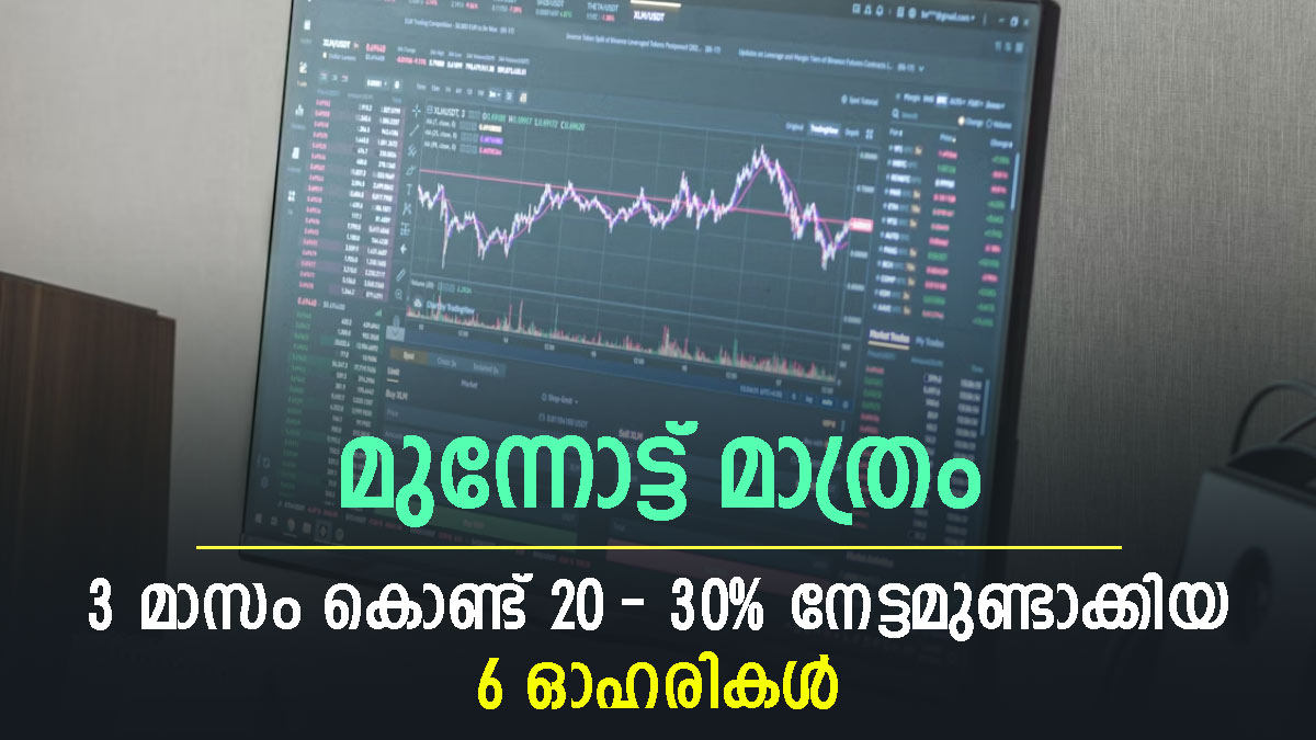 കഴിഞ്ഞ മൂന്ന് മാസത്തിനിടെ വലിയ കുതിപ്പാണ് ഓഹരി വിപണിയിലുണ്ടായത്. സൂചികകൾ പുതിയ ഉയരങ്ങൾ താണ്ടി മുന്നേറി. ഏകദേശം 5 ശതമാനം വളർച്ചയാണ് ഓഹരി വിപണി നേടിയത്. ഈ സമയപരിധിയിൽ, 30 സെൻസെക്സ് ഓഹരികളിൽ 16 എണ്ണവും സൂചികയെ മറികടന്നു. അവയിൽ ആറെണ്ണം 20 മുതൽ 30 ശതമാനം വരെ നേട്ടം രേഖപ്പെടുത്തി. ഏതൊക്കെയാണ് ആറ് ഓഹരികളെന്ന് നോക്കാം.