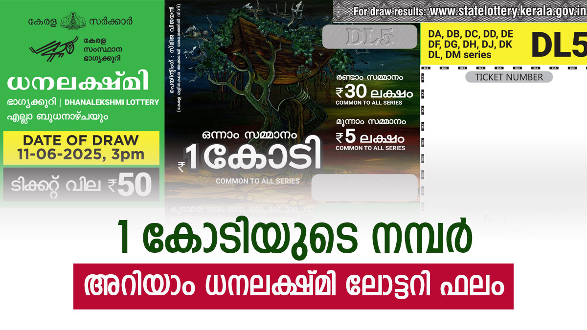 LIVE Kerala Lottery Results Today, 05-10-2025: ധനലക്ഷ്മി DL-25 ലോട്ടറിയുടെ നറുക്കെടുപ്പ് ഫലം പ്രഖ്യാപിച്ചു. ഉച്ചകഴിഞ്ഞ് 3 മണിക്ക് തിരുവനന്തപുരത്തെ ബേക്കറി ജംഗ്ഷനു സമീപമുള്ള ഗോർക്കി ഭവനിൽ ലോട്ടോ മെഷീൻ വഴിയാണ് ഏറെ പ്രതീക്ഷയോടെ കാത്തിരുന്ന ധനലക്ഷ്മി DL-25 ഭാഗ്യ നറുക്കെടുപ്പ് നടന്നത്. ധനലക്ഷ്മി DL-25 ഭാഗ്യ നറുക്കെടുപ്പ് ഭാഗ്യശാലികൾക്ക് ആവേശകരമായ സമ്മാനങ്ങൾ വാഗ്ദാനം ചെയ്യുന്നു. ഒന്നാം സമ്മാന ജേതാവിന് 1 കോടി രൂപ ലഭിക്കും. 30 ലക്ഷം രൂപയാണ് രണ്ടാം സമ്മാനം. ഇന്നത്തെ ഭാഗ്യനമ്പറുകൾ പരിശോധിക്കാം.