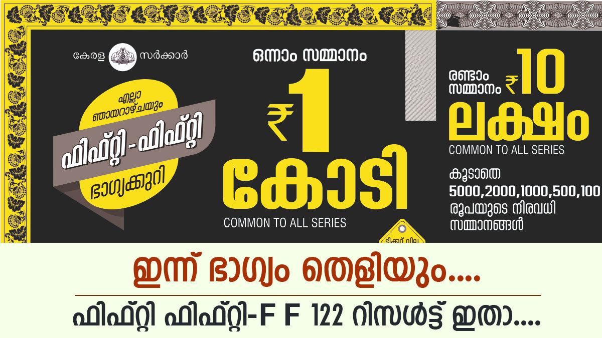 ഫിഫ്റ്റി ഫിഫ്റ്റി-F F 122 ഭാഗ്യക്കുറി പോക്കറ്റിലുണ്ടോ? ഇന്നത്തെ ടിക്കറ്റിന്റെ നറുക്കെടുപ്പ് ഫലം പ്രഖ്യാപിച്ചു. ഇന്ന് തിരുവനന്തപുരം ബേക്കറി ജംങ്ഷന് സമീപമുള്ള ഗോർക്കി ഭവനിൽ വെച്ചാണ് ഫലം പുറത്ത് വിട്ടത്. 50 രൂപ വിലയുള്ള ഫിഫ്റ്റി ഫിഫ്റ്റി ഭാഗ്യക്കുറിയുടെ ഒന്നാം സമ്മാനം 1 കോടി രൂപയാണ്. രണ്ടാം സമ്മാനം 10 ലക്ഷം രൂപയും, മൂന്നാം സമ്മാനം 5000 രൂപയും.
