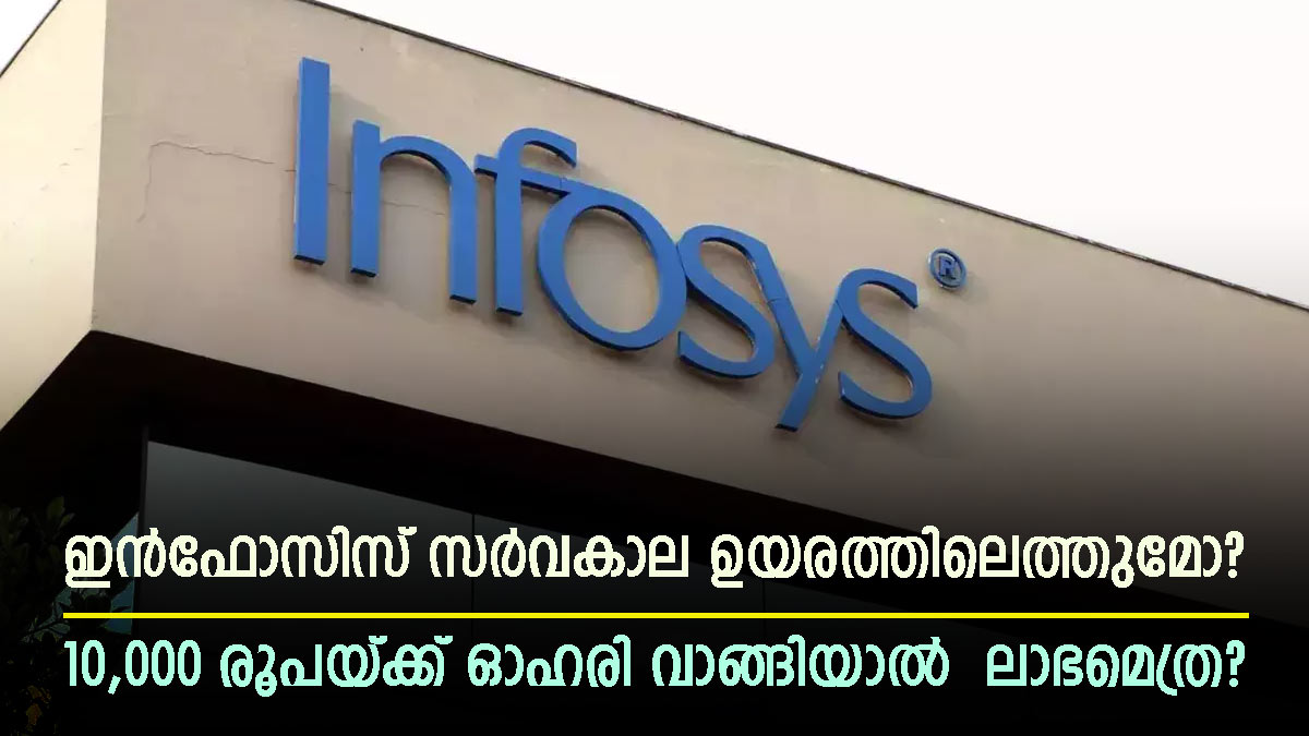 തിങ്കളാഴ്ചയിലെ ക്ലോസിംഗ് നിലവാരം പ്രകാരം 1,652.10 രൂപയില് ലഭ്യമായ ഇന്ഫോസിസ് ഓഹരികളില് 10,000 രൂപ നിക്ഷേപിച്ചാല് 6 ഓഹരികളാണ് വാങ്ങാന് സാധിക്കുക. ഓഹരി 1,953.90 എന്ന സര്വകാല ഉയരത്തിലേക്ക് എത്തിയാല് 10,000 രൂപ നിക്ഷേപത്തിന്റെ മൂല്യം 12,000 രൂപയായി ഉയരും.