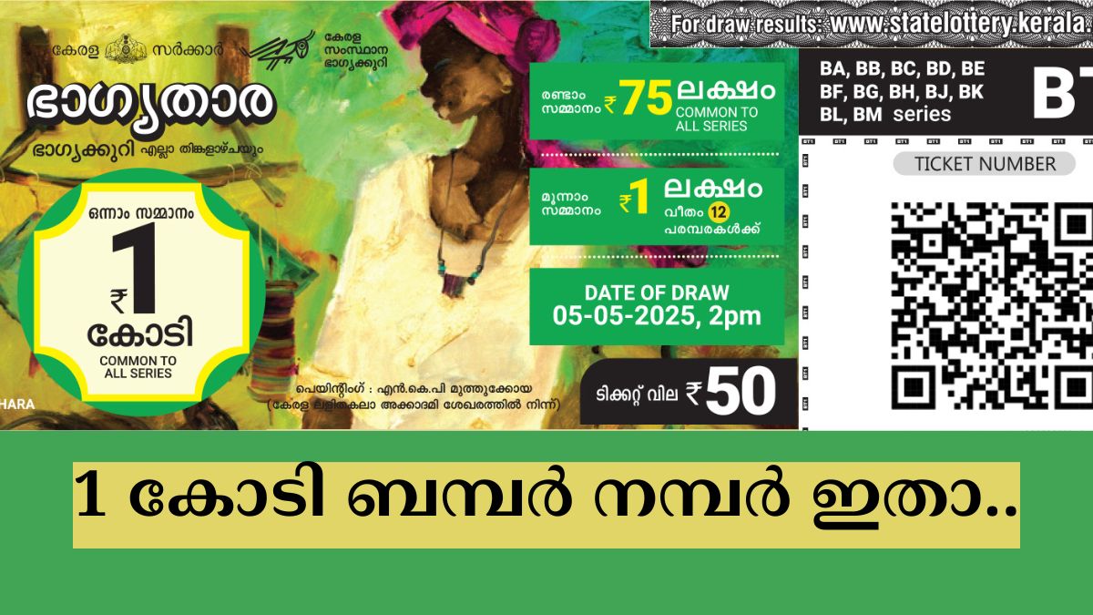 എല്ലാ തിങ്കളാഴ്ചയും 1 കോടി ഉറപ്പാണ്. ഇന്നത്തെ കേരള സംസ്ഥാന ഭാഗ്യക്കുറിയായ ഭാഗ്യതാരയുടെ റിസൾട്ട് എത്തി. നിങ്ങളുടെ പോക്കറ്റിലും ഭാഗ്യതാര BT-5 ഉണ്ടോ? 50 രൂപ ടിക്കറ്റ് വിലയുള്ള ഭാഗ്യതാര ലോട്ടറിയുടെ ഒന്നാം സമ്മാനം 1 കോടിയാണ്. രണ്ടാം സമ്മാനം 75 ലക്ഷവും മൂന്നാം സമ്മാനം 1 ലക്ഷം രൂപയുമാണ്. ഇന്നത്തെ ഭാഗ്യനമ്പറുകൾ തിരഞ്ഞെടുത്തത് തിരുവനന്തപുരം ബേക്കറി ജംങ്ഷന് സമീപമുള്ള ഗോർക്കി ഭവനിൽ വെച്ചാണ്. ഭാഗ്യതാര ഭാഗ്യക്കുറിയുടെ ഇന്നത്തെ ഭാഗ്യശാലി നിങ്ങളായിരിക്കും. റിസൾട്ട് ഇതാ....