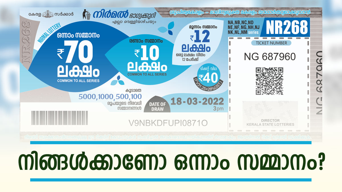 ഇന്നത്തെ നിർമൽ NR-417 ലോട്ടറി ടിക്കറ്റ് കൈവശമുണ്ടോ? നറുക്കെടുപ്പ് ഫലം പ്രഖ്യാപിച്ചു. വെള്ളിയാഴ്ചകളിൽ നറുക്കെടുപ്പ് നടത്തുന്ന നിർമൽ ഭാഗ്യക്കുറിയുടെ ഒന്നാം സമ്മാനം 70 ലക്ഷം രൂപയാണ്. രണ്ടാം സമ്മാനം 10 ലക്ഷവും മൂന്നാം സമ്മാനം 1 ലക്ഷവുമാണ്. ഇന്ന് തിരുവനന്തപുരം ബേക്കറി ജംങ്ഷന് സമീപമുള്ള ഗോർക്കി ഭവനിൽ വെച്ചാണ് നിർമൽ ഭാഗ്യക്കുറിയുടെ ഫലം പ്രഖ്യാപിച്ചത്. 40 രൂപ വിലയുള്ള നിർമൽ ഭാഗ്യക്കുറിയുടെ ഭാഗ്യശാലികളെ അറിയാം. നറുക്കെടുപ്പ് ഫലം ഇതാ...