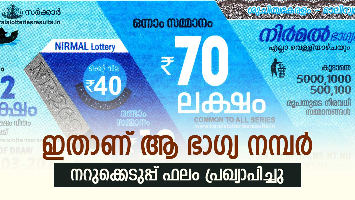 ഇന്നത്തെ നിർമ്മൽ ഭാഗ്യക്കുറിയുടെ റിസൾട്ട് എത്തി. നിങ്ങളാണോ ഇന്നത്തെ ഭാഗ്യശാലി? നിർമൽ NR-428 ലോട്ടറിയുടെ നറുക്കെടുപ്പ് ഫലം ഇന്ന് തിരുവനന്തപുരം ബേക്കറി ജംങ്ഷന് സമീപമുള്ള ഗോർക്കി ഭവനിൽ വെച്ചാണ് പ്രഖ്യാപിച്ചത്. 40 രൂപ വിലയുള്ള നിർമൽ ഭാഗ്യക്കുറിയുടെ ഒന്നാം സമ്മാനം 70 ലക്ഷം രൂപയാണ്. രണ്ടാം സമ്മാനം 10 ലക്ഷവും മൂന്നാം സമ്മാനം 1 ലക്ഷവുമാണ്. ഇന്ന് ദുഖവെള്ളി ദിനത്തിൽ സന്തോഷകരമായ നേട്ടം ആർക്കാണ്? നറുക്കെടുപ്പ് ഫലം ഇതാ....