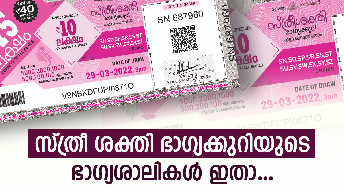 കേരള സംസ്ഥാന ഭാഗ്യക്കുറികളിൽ ചൊവ്വാഴ്ച നറുക്കെടുക്കുന്ന സ്ത്രീ ശക്തിയുടെ റിസൾട്ട് പ്രഖ്യാപിച്ചു. തിരുവനന്തപുരം ബേക്കറി ജംങ്ഷന് സമീപമുള്ള ഗോർക്കി ഭവനിൽ വെച്ചാണ് ഭാഗ്യശാലികളെ കണ്ടെത്തിയത്. ഇന്നത്തെ സ്ത്രീ ശക്തി SS-461 ലോട്ടറിയുടെ ഒന്നാം സമ്മാനം 75 ലക്ഷം രൂപയാണ്. രണ്ടാം സമ്മാനം 10 ലക്ഷം രൂപയും മൂന്നാം സമ്മാനമായി ലഭിക്കുന്നത് 5000 രൂപയുമാണ്. 40 രൂപ വിലയുള്ള സ്ത്രീ ശക്തി ലോട്ടറി നിങ്ങളുടെ കൈയിലുണ്ടോ? ഇന്നത്തെ ഭാഗ്യ നമ്പറുകളിൽ നിങ്ങൾക്കും ഭാഗ്യം തെളിയും. നറുക്കെടുപ്പ് ഫലം ഇതാ...