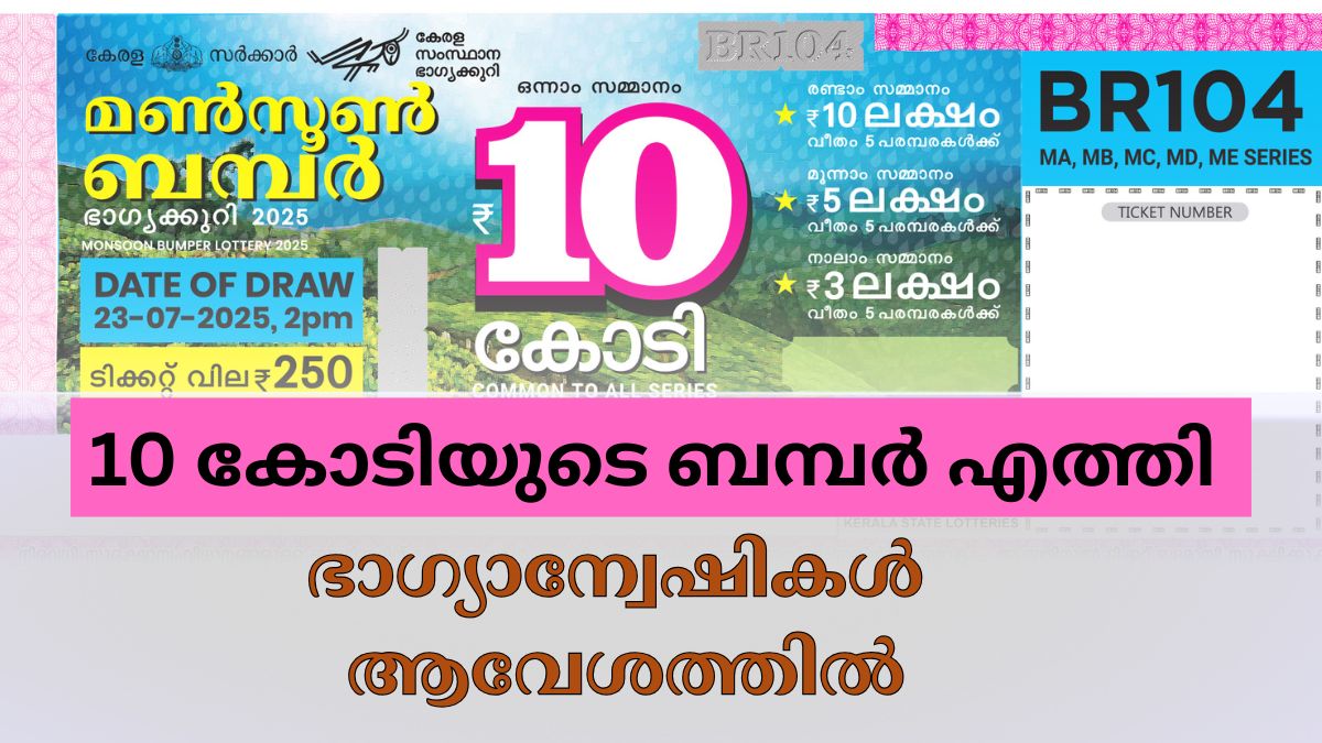 കാത്തിരിപ്പിനൊടുവിൽ ബമ്പറെത്തി. 250 രൂപ മുടക്കി 10 കോടിയുടെ ഭാഗ്യം ആർക്ക്? അതെ, മൺസൂൺ ബമ്പർ BR 104 ലോട്ടറിയുടെ നറുക്കെടുപ്പ് ഫലം പ്രഖ്യാപിച്ചു. മെയ് 28 മുതൽ വിൽപ്പന ആരംഭിച്ച മൺസൂൺ ബമ്പർ ഒടുവിൽ ഇന്ന് ഭാഗ്യ സമ്മാനങ്ങളുമായി എത്തിയിരിക്കുന്നു. ബമ്പർ ടിക്കറ്റ് വേഗം നോക്കിക്കോളൂ, നിങ്ങളുടെ ടിക്കറ്റിലെ നമ്പർ ഈ ലിസ്റ്റിലും ഉണ്ടോ?