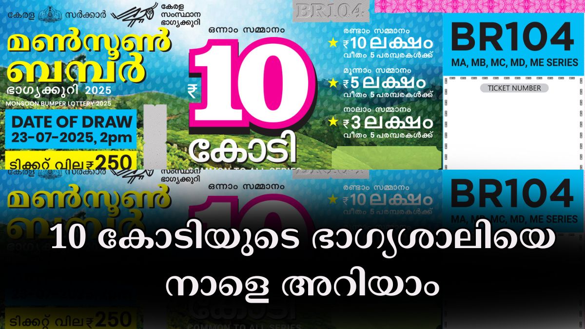 അടുത്ത ബമ്പറിനുള്ള കാത്തിരിപ്പ് അവസാനിക്കാറായി. 10 കോടിയുമായി കേരള സർക്കാരിൻ്റെ മൺസൂൺ ബമ്പർ ബിആർ 104 ഭാഗ്യക്കുറിയുടെ നറുക്കെടുപ്പ് നാളെ ജൂലൈ 23ന് നടക്കും. വിഷു ബമ്പറിനു പിന്നാലെയാണ് മൺസൂൺ ബമ്പറിൻ്റെ നറുക്കെടുപ്പ് എത്തുന്നത്. ഇത്തവണ ആരായിരിക്കും ബമ്പർ ഭാഗ്യശാലി?