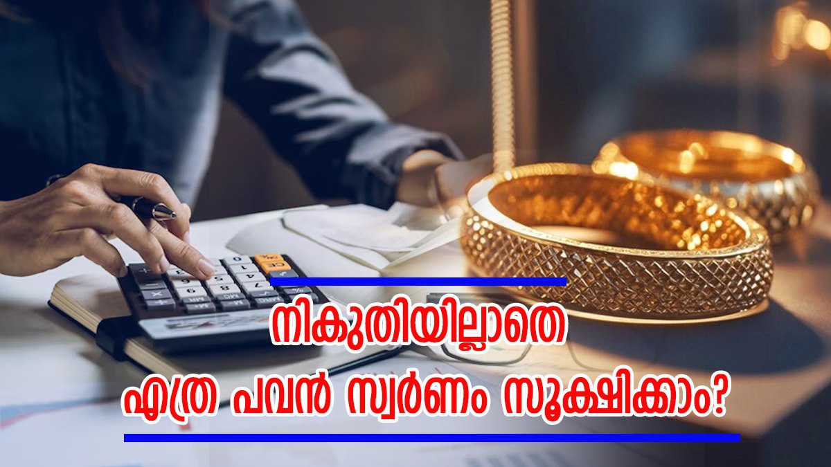 ഒരു വ്യക്തിയുടെ കൈവശം സൂക്ഷിക്കാവുന്ന സ്വർണത്തിനും കണക്കുണ്ട്. വിവാഹം കഴിഞ്ഞ സ്ത്രീക്ക് 500 ഗ്രാം സ്വർണം കരുതാം. വിവാഹം കഴിക്കാത്ത സ്ത്രീക്ക് 250 ഗ്രാം സ്വർണം വരെ കൈവശം വെക്കാം. പുരുഷൻമാർക്ക് 100 ഗ്രാം സ്വർണം വരെ സൂക്ഷിക്കാം. ഈ സ്വർണത്തിനൊന്നും നികുതി നൽകേണ്ടതില്ല.