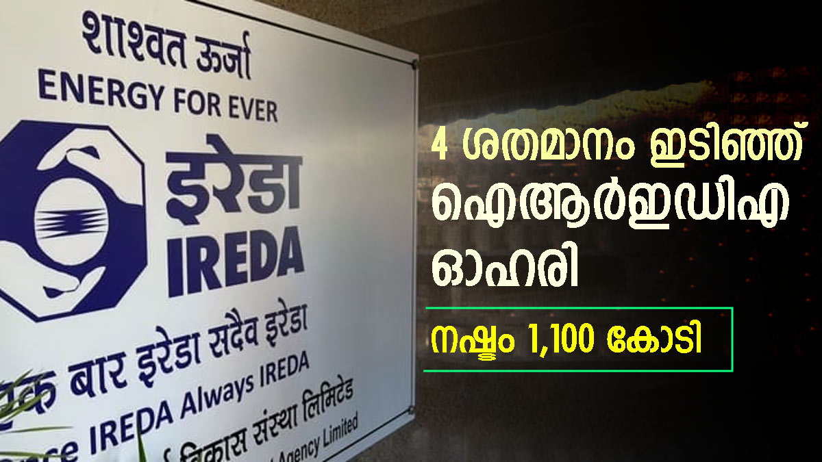 ബുധനാഴ്ചത്തെ ട്രേഡിംഗ് സെഷനിൽ ഐആർഇഡിഎ ഓഹരി വില 4 ശതമാനത്തോളമാണ് ഇടിഞ്ഞത്. 127.35 രൂപയിലാണ് ആരംഭിച്ചത്. നിലവിൽ 125.80 രൂപയിലാണ് വ്യാപാരം. ഓഹരി ഇടിഞ്ഞതോടെ 1,100 കോടിയിലധികം രൂപയുടെ നഷ്ടമാണ് നിക്ഷേപകർക്കുണ്ടായത്. അതോടെ കമ്പനിയുടെ വിപണി മൂല്യം മുൻ സെഷനിലെ 34,766 കോടി രൂപയിൽ നിന്ന് നടപ്പ് സെഷനിൽ 33,664 കോടി രൂപയായി കുറഞ്ഞു.