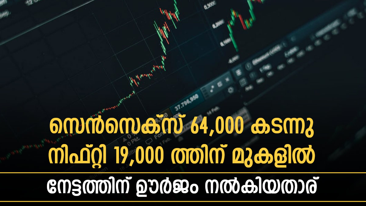 തുടര്ച്ചയായ മൂന്ന് ദിവസങ്ങളില് നേട്ടം തുടര്ന്നാണ് നിഫ്റ്റി ആദ്യമായി 19,000 എന്ന മാര്ക്ക് തൊടുന്നതും സെന്സെക്സ് 64,000 ത്തിലേക്ക് കടക്കുന്നതും. മൂന്ന് സെഷനുകളിലായി നിക്ഷേപകർക്ക് 3 ലക്ഷം കോടിയിലധികം രൂപയുടെ നേട്ടമാണ് ഉണ്ടായത്. മൺസൂണിന്റെ ആരംഭം, എച്ച്ഡിഎഫ്സി ബാങ്കിന്റെയും എച്ച്ഡിഎഫ്സിയുടെയും ലയന പൂർത്തീകരണ പ്രഖ്യാപനം, ജൂണിലെ ഡെറിവേറ്റീവ് സീരീസിന്റെ എക്സ്പയറിക്ക് മുൻപുള്ള റോൾ ഓവറുകൾ എന്നിവയാണ് വിപണിയിലെ നേട്ടത്തിന് കാരണമായ ഘടകങ്ങൾ.