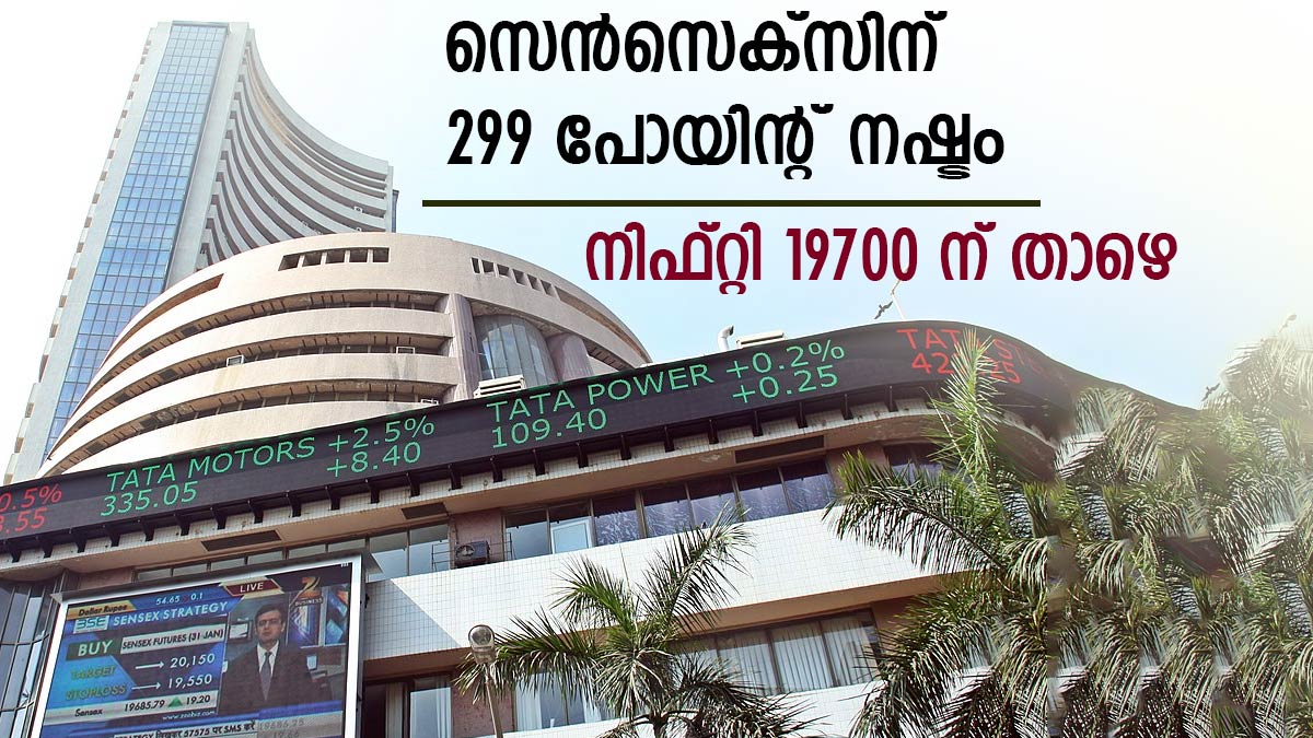 ഐടിസി, റിലയൻസ് ഇൻഡസ്ട്രീസ്, കൊട്ടക് മഹീന്ദ്ര ബാങ്ക് എന്നിവ ഉൾപ്പടെ മുൻനിര ഓഹരികൾ ഇടിവ് നേരിട്ട തിങ്കളാഴ്ചയും ഇന്ത്യൻ ആഭ്യന്തര സൂചികകൾ നഷ്ടത്തിൽ ക്ലോസ് ചെയ്തു. സെൻസെക്സ് 299 പോയിന്റ് നഷ്ടത്തിൽ 66,384.78 ലും നിഫ്റ്റി 79 പോയിൻറ് താഴ്ന്ന് 19,666.45 ലും വ്യാപാരം അവസാനിച്ചു. തുടർച്ചയായ രണ്ടാം സെഷനിലാണ് വിപണി ഇടിയുന്നത്.