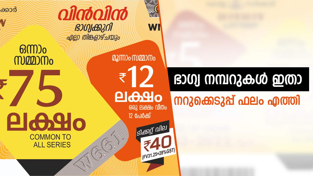 കേരള സംസ്ഥാന ഭാഗ്യക്കുറി വകുപ്പ് എല്ലാ തിങ്കളാഴ്ചയും നറുക്കെടുക്കുന്ന ലോട്ടറിയാണ് വിൻ- വിൻ. ഈ ആഴ്ചയിലെ വിൻ-വിൻ W-801 ഭാഗ്യക്കുറിയുടെ റിസൾട്ട് എത്തി. ഇന്ന് തിരുവനന്തപുരം ബേക്കറി ജംങ്ഷന് സമീപമുള്ള ഗോർക്കി ഭവനിൽ വെച്ചാണ് ഫലം പ്രഖ്യാപിച്ചത്.40 രൂപ വിലയുള്ള വിൻ-വിൻ ഭാഗ്യക്കുറിയുടെ ഒന്നാം സമ്മാനം 75 ലക്ഷം രൂപയും രണ്ടാം സമ്മാനം 5 ലക്ഷം രൂപയും മൂന്നാം സമ്മാനം 1 ലക്ഷം രൂപയുമാണ്.